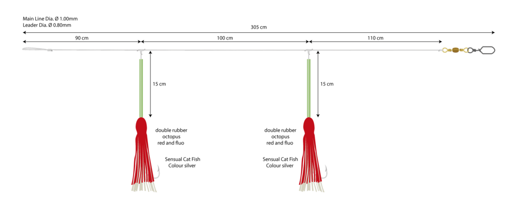 This is a system with two single hooks, octopuses in fluorescent red and luminous tubing, perfect for hake, cod and saithe. The rig must be guided a few metres above the bottom with a heavy weight of up to 800 g. The hooks are baited with fish scraps. With this system, you have to set the hook immediately. It is 305 cm long and the main line has a thickness of 1.00 mm and the leader line 0.80 mm. Don't just fish the system on the bottom, but also make a few turns of the reel with ‘stops’ until you are about 30 m above the bottom. If there is no bite, repeat the process.