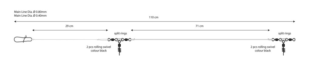 This is a basic system for most sea anglers. The main line is 0.80mm thick and has a safety break-off point of 0.4mm diameter. It is a versatile system that can be used freely with different lures. It works best in 5 to 50 m deep waters. It can be combined with many leader systems. This system is combined with natural bait systems. It is 110cm long and has two spiral swivels for easy turning of the side arms.