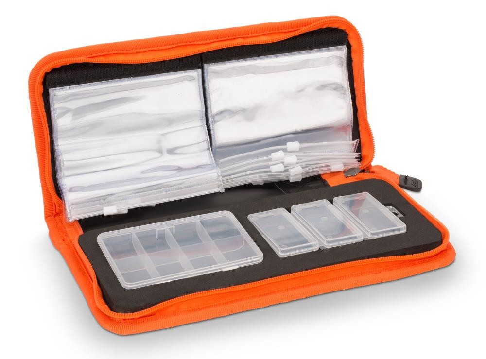 The Multi Organizer I is a flat bag with 3 plastic boxes for optimal storage of tied leaders, mounts and small parts. The Multi Organizer II is a slightly smaller version with 2 plastic boxes.