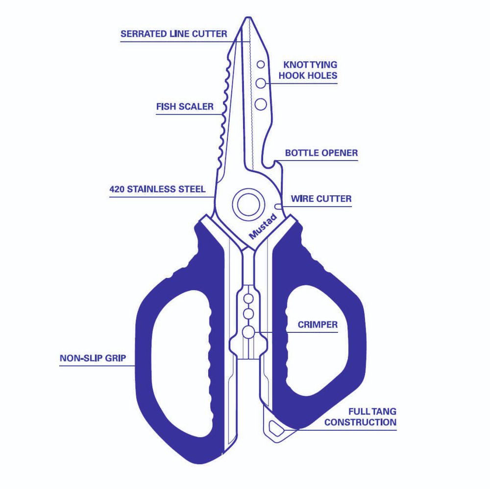The Mustad 7" Scissors are made from high-quality 420 stainless steel and feature a robust full tang construction that guarantees durability and reliability. These versatile fishing scissors are not only ideal for cutting fishing lines, but also have a number of practical features: