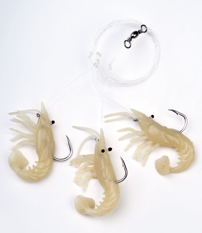 The side arm system consists of three rubber shrimps that are realistically shaped and self-illuminating. With a length of approx. 8 cm, they provide intense stimulation – particularly effective in deeper or darker layers of water. Each shrimp is mounted on a sturdy 6/0 hook, which provides ideal support for powerful sea fish.