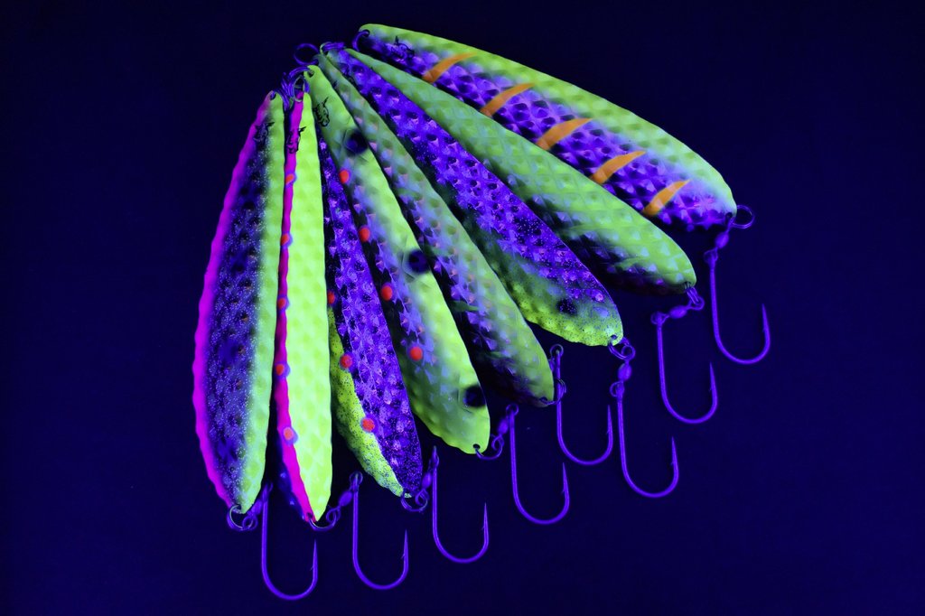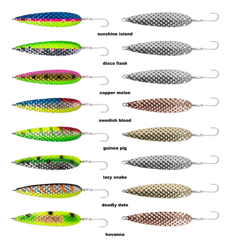 This is a new spoon for large salmon. Due to its size of 165mm and the slightly higher dead weight (compared to usual dragging spoons) of 40g, the Salty Diamond spins seductively whenever the speed is reduced a bit. This usually happens due to the influence of waves or on the inside when cornering. This special series was developed especially for capital hiking salmonids with the cooperation of Peter Cernold (Team 4Reels Sweden) and Mike Luner (Team Beluga Germany). The two specialists have based their colouring on the most successful patterns in Scandinavia and Germany (Rügen). The indicators are mounted with a large single hook, which guarantees an optimal hook fit, as many professionals use it for targeted salmon fishing. The spoons are UV activ.