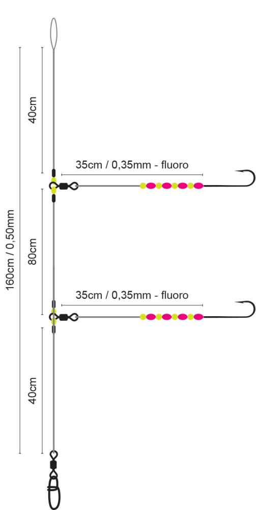 This leader has two or three side arms (depending on the hook size) with a length of 35cm. Fluo beads are attached in front of the hooks. The main line has a thickness of 0.50mm and the mouth lines of 0.35mm. The total length of the leader is 160cm. The leader is available with different hook sizes.