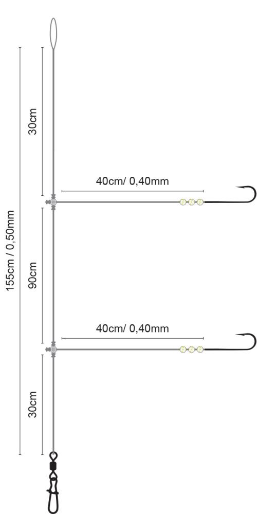 This leader has two or three side arms (depending on the hook size) with a length of 35cm. Crystal beads are attached in front of the hooks. The main line has a thickness of 0.50mm and the mouth lines of 0.40mm. The total length of the leader is 155cm. The leader is available with different hook sizes.