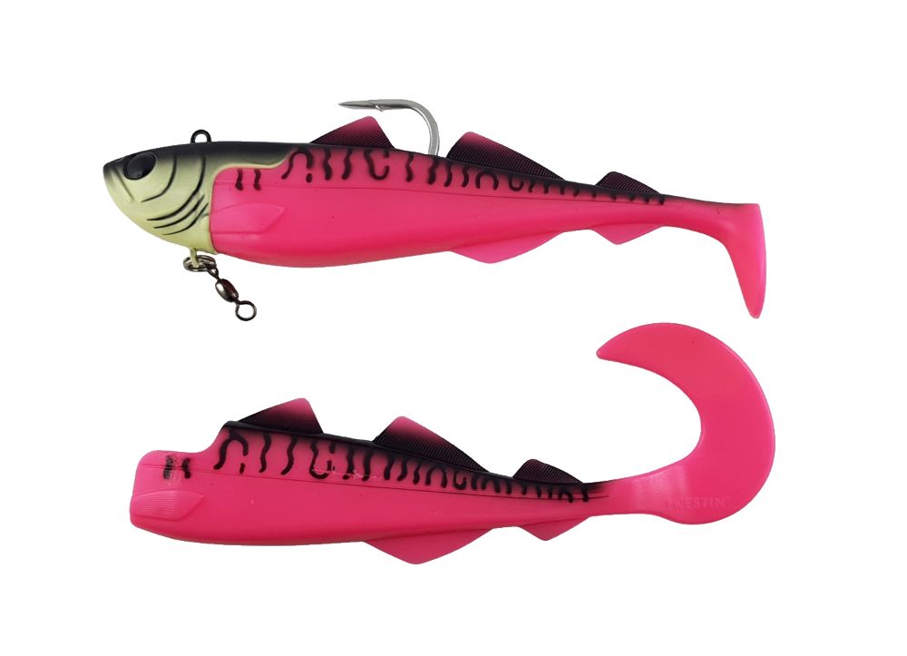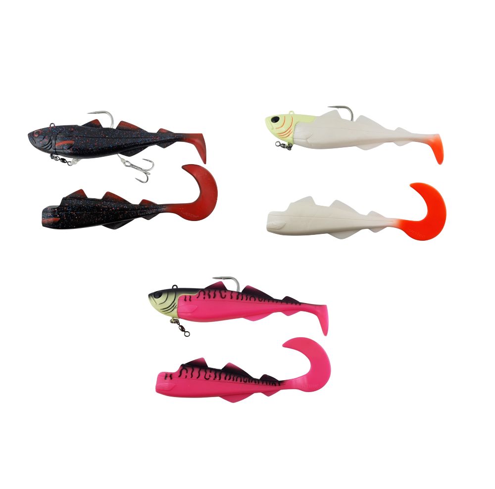 The scope of delivery includes an extremely strong stinger (only 300g), which is tied with durable braid, and two different rubber bodies. The first body has a twister tail, which creates gentle, meandering movements even at low speeds. The second body with a paddle tail imitates the panicked behavior of a wounded fish and thus specifically attracts the attention of predatory fish.