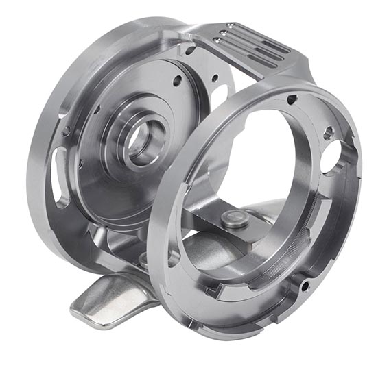 - Frame, side cover and spool CNC-milled from one piece of aluminum
