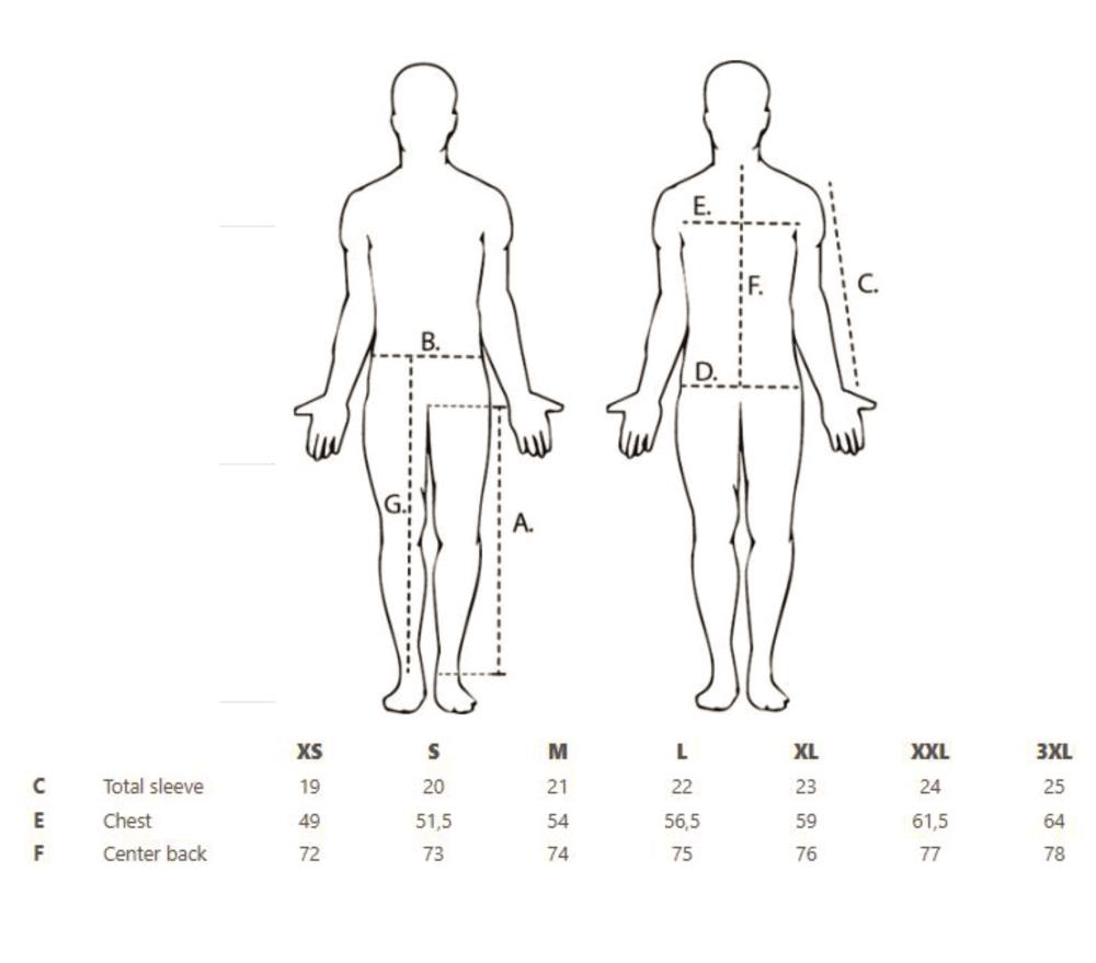 | E - Chest | 51,5 | 54 | 56,5 | 59 | 61,5 | 64 |
