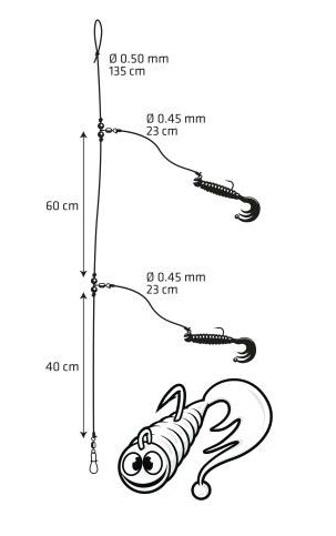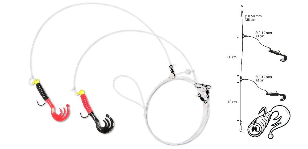 This special leader has been designed for catching whiting. There are two different versions. The difference between the two versions is the distance between the side arms and the distance to the swivel. The first version is divided 50/50, which means that the distance between the two side arms and the swivel is 50cm. In the second version, 40/60, the distance between the side arms is 60 cm and the distance to the swivel is 40 cm. Both leader versions have a 0.50 mm thick main line and the side arms are 0.45 mm thick. The load capacity of the leaders is specified as 17 kg. The twister tails are available in four different colors. The twisters with curly tails are 5.5 cm long and are attached to a 2 g Trophy LOOky jig head with a hook size of 1. The leaders are 135 cm long and the side arms are 23 cm long.