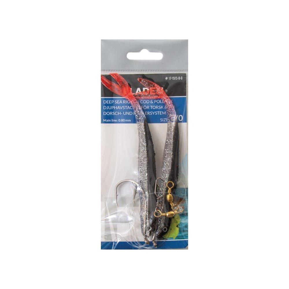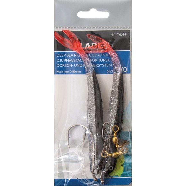 This twintail rig consists of two elongated rubber fish (14cm) that imitate sand eels. They are mounted on size 8/0 hooks and attached to a monofilament main line of 0.80mm thickness. This leader is available in the colours Blue-Glitter and Black-Glitter. It is ideal for catching cod and saithe.