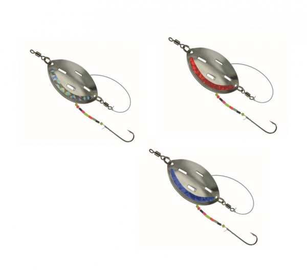 This is a spoon for flatfish and sea fishing. On the spoon is a completely finished leader (swivel, hook, line and beads) already mounted. The different colours and the beads increase the attraction for the fish. It is used as follows: Let the spoon sink - lift the tip of the rod and catch up 2-3 reel turns and repeat. The resulting "cloud of dust" makes the fish curious and attracts attention. Available in the weight classes 40g and 60g, as well as three common colour variants. Each package contains one piece.