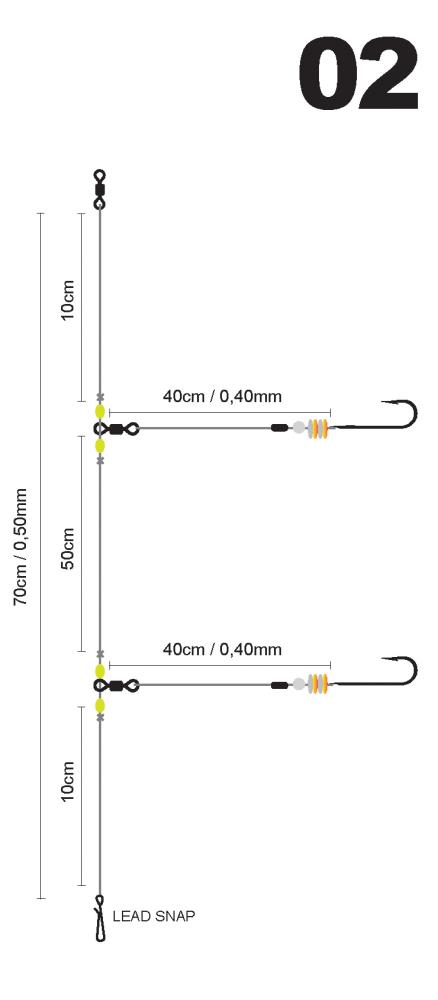 This leader has two side arms with a length of 70cm. The side arms have a length of 40cm. The main line has a thickness of 0.50mm and the mouth lines of 0.40mm. There are metallic-coloured leaves and a crystal bead in front of the hooks. The leader is available with different hook sizes.