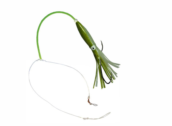Dieses Spezial-System baut Enrico Wyrwa auf Hitra, um die ganz großen Leng an den Haken zu bekommen. Extra starke Materialien, eine Schnurverbindung ohne Knoten - in einem Stück. Die 1,20mm starke monofile Schnur ist doppelt gebunden und wird von dem Leucht-Schutz-Schlauch geschützt. Sicherer gehts nicht! Im Gegensatz zu System II verfügt dieses System über zwei Einzelhaken der Größe 10/0, an denen ein Fischfilet präsentiert wird. Da der Leng sehr argwöhnisch ist und den Köder nur mag, wenn dieser nahezu naturgetreu angeboten wird. Das Filet sollte wie eine Handfläche montiert sein, damit es im Wasser wie ein Fisch flattert. Ein einfacher Fleischklumpen wird oft verschmäht. Es gibt sechs verschiedene Farben und zwei unterschiedliche Oktopusse als B2 mit 10cm (alle anderen Farben) und Hogy Oktopusse der Größe 20cm (oliv + crab). Am Ende des Vorfaches befindet sich noch ein starker Sicherheitswirbel der Größe 3/0. Aus produktionstechnischen Gründen kann es vorkommen, dass die Farben der Oktopusse leicht abweichen bzw. sich ändern.