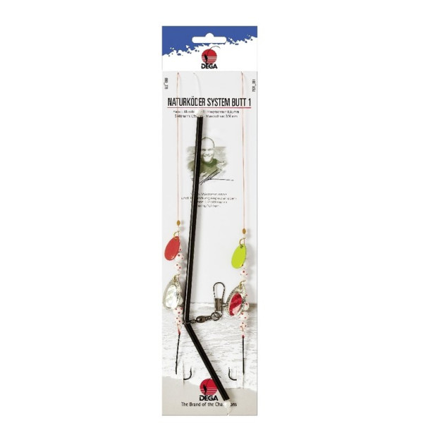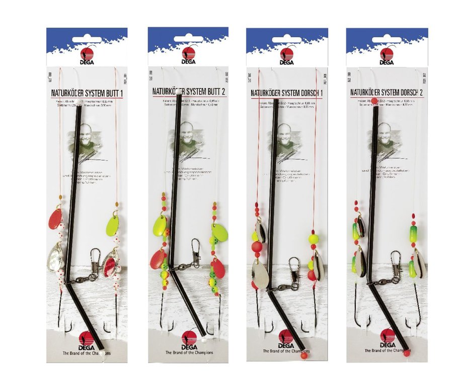 Diese Naturköder-Systeme sind konzipiert für die moderne Angelei vom Kutter oder Boot. Sie sind handgefertigt und von Qualitätskontrolleuren geprüft. Es gibt jeweils zwei Modelle für die Angelei auf Butt oder Dorsch. Die Vorfächer besitzen jeweils zwei Haken der Größe 1, eine Schnurstärke von 0,60mm/0,50mm, ein Running Boom und verschiedenfarbige Spinnerblätter und Lockperlen.